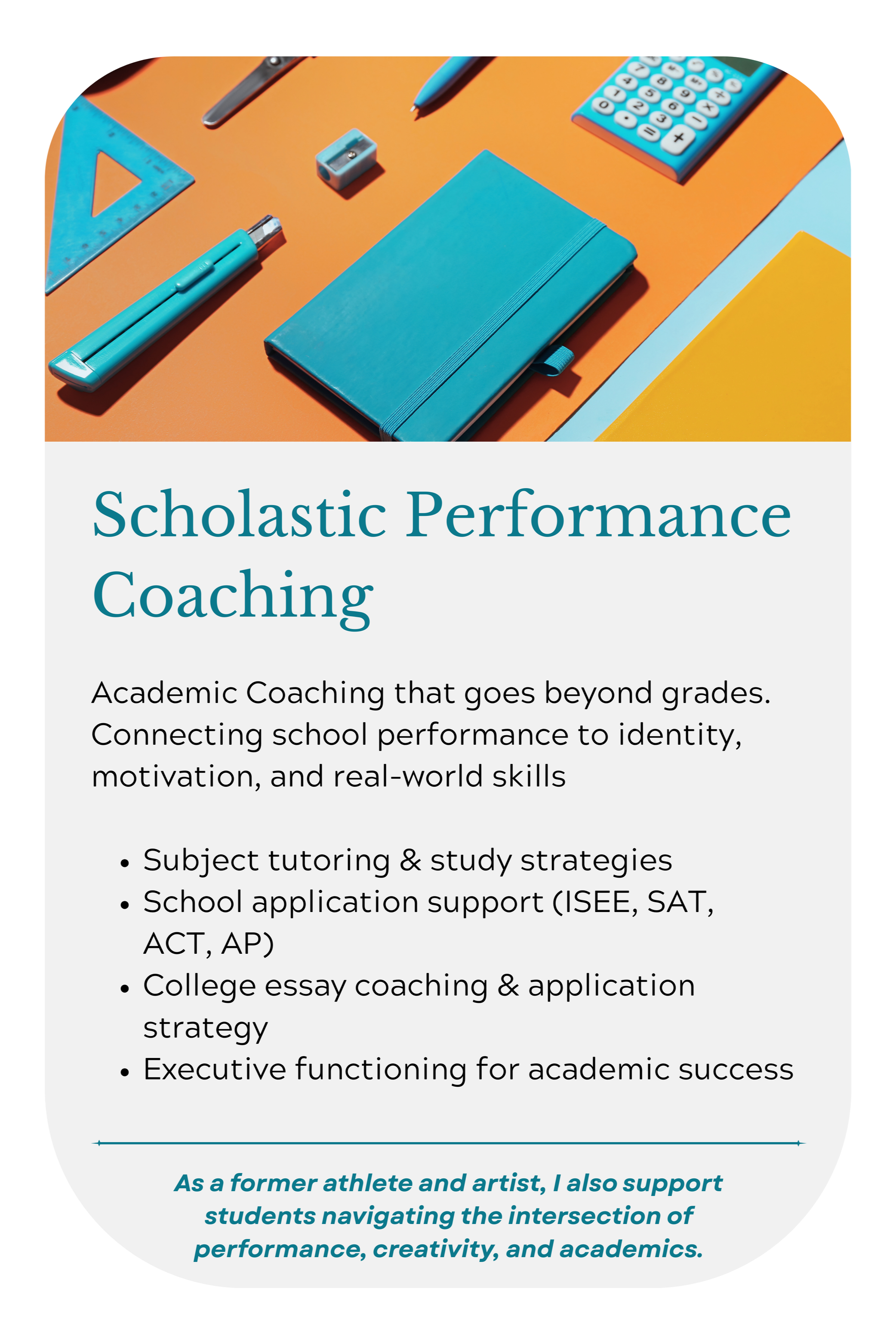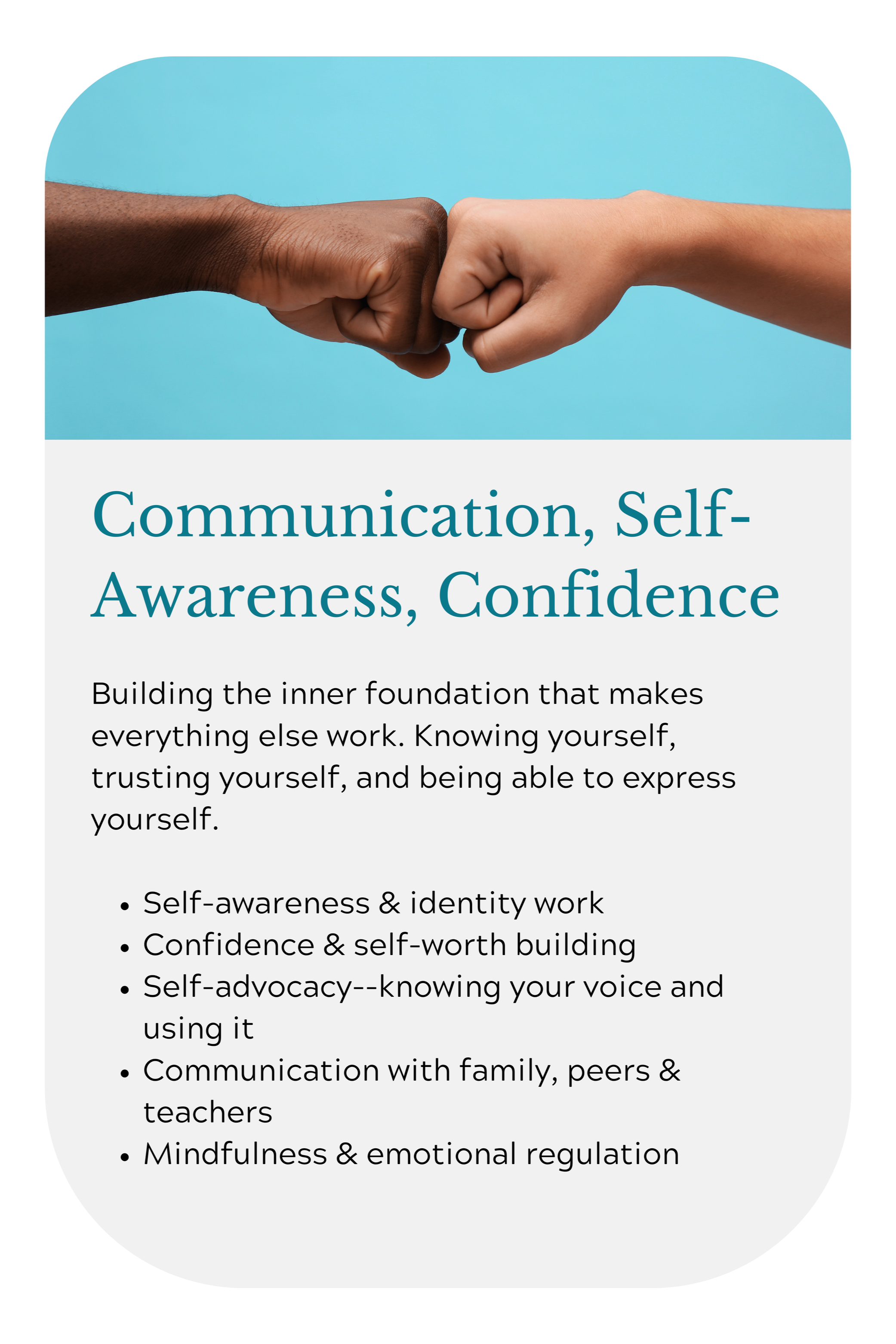 My work with teens starts from the inside out. Before systems, before grades—before anything—we start with self-awareness. Who are you? What gets in your way? What do you actually care about? From that foundation, we build structure, confidence, and the courage to show up as themselves—at home, and school, and in the world.
